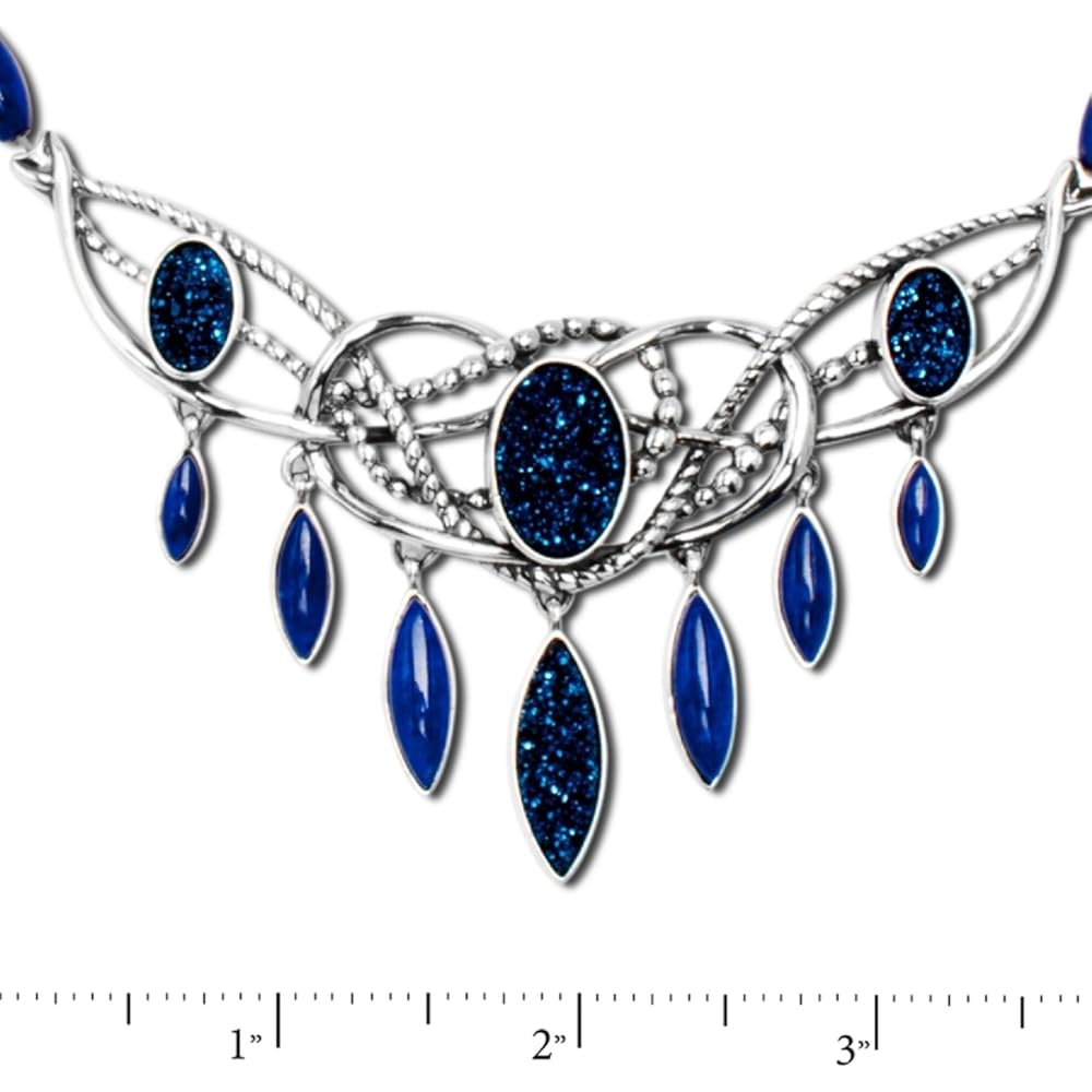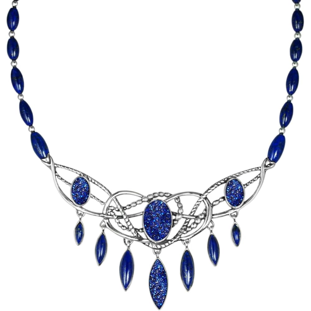Always be on trend in this bold fashion accessories. The dream-like combination of marquise-shaped and barrel-shaped lapis and sterling silver beads gleams, and the addition of sparkling druzy stones raises this statement necklace to whole new level of brilliance.