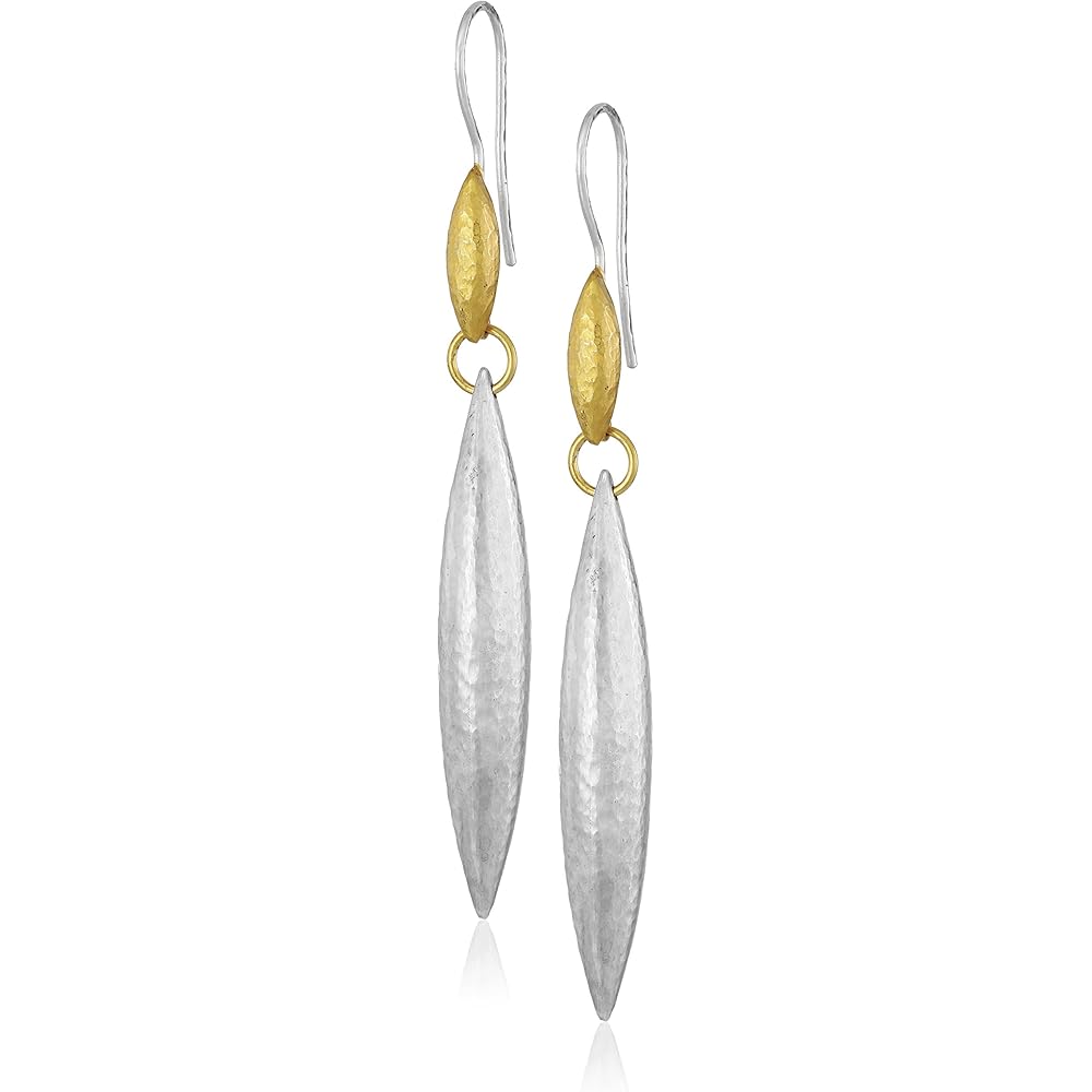 These GURHAN “Wheat” Silver with High Karat Gold accent drop earrings have a chic, cosmopolitan charm. Each earring contains two slender, pointed-oval-shaped ornaments hanging one above the other, the lower one is longer and sterling silver, while the upper is smaller and forged from solid 24k gold.