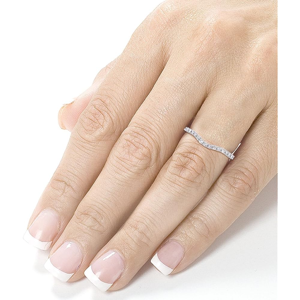 Wedding ring by Kobelli showcases round-cut diamonds, crafted in solid White Gold. The unique curve drops in about 1.5 mm and the length across the curve that measures about 9.5 mm. It allows close nesting, and easy re-sizing means it always has a perfect fit.