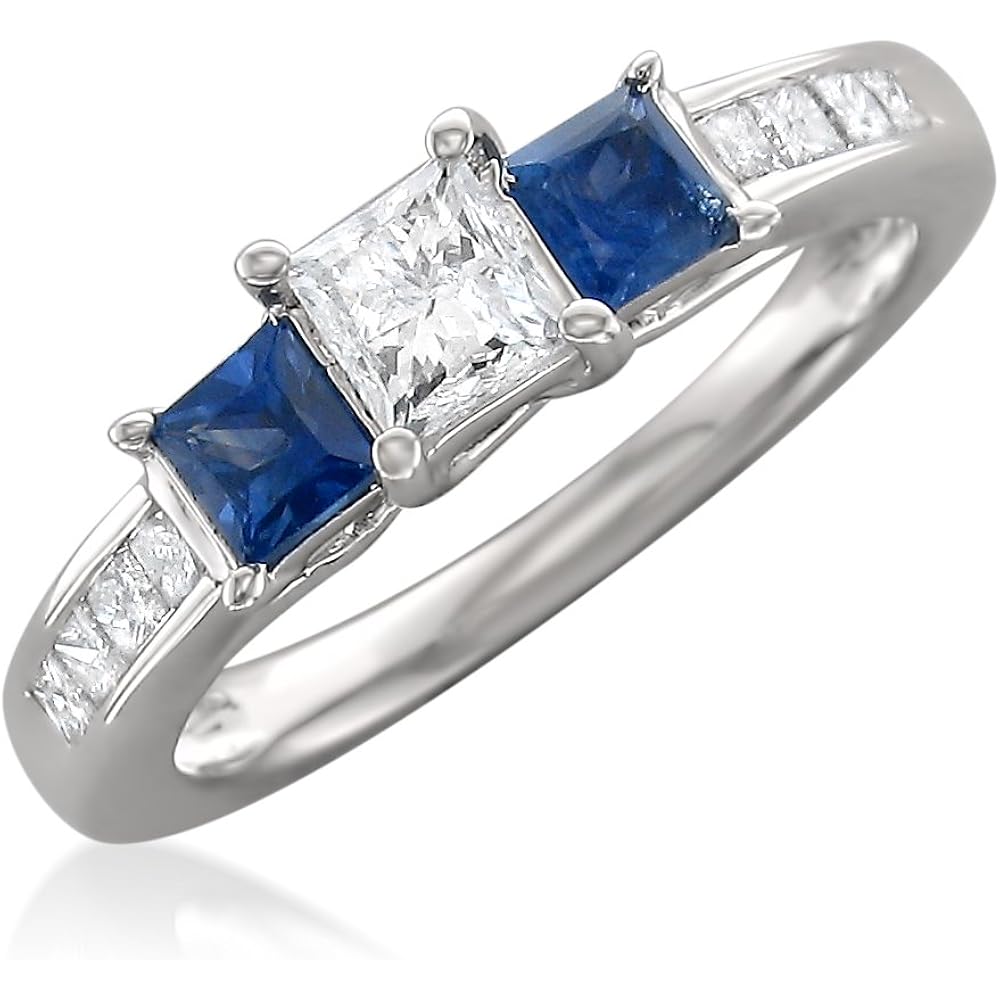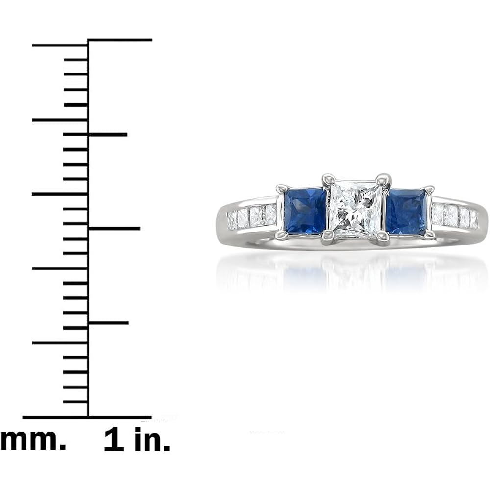 Featuring one sparkling princess-cut diamond that is accentuated by two beautiful blue sapphires, while another eight princess-cut diamonds are perfectly situated on a 14K white gold band. The diamond gemstones is graded minimum I-J color and I1-I2 clarity, while sapphire is blue color.