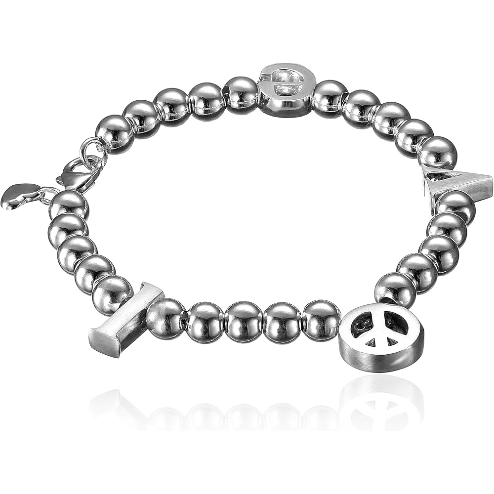 Discover the New York designer’s latest revelation, which cleverly re-invents the standard charm bracelet into a modern and sleek interpretation of the popular design. Crafted of solid 925 Sterling Silver, bracelet features “Peace” symbol as letter “O” to create word of life “Love” and included an heart symbol charm on its clasp. All combination may be spelled as “Love and Peace”, shows that it’s more than jewelry or accessories but moreover it’s a shape of propitiation greeting. A clever and sensible work of art.