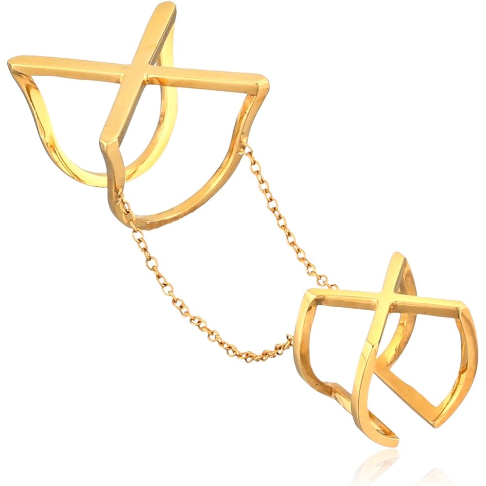 Two open rings is crafted of yellow-gold-plated sterling silver with molded X centerpieces connected by two delicate cable chains. This new X style double ring is perfect for any woman who wants to stay chic in modernized look, so get one for your chic woman today.