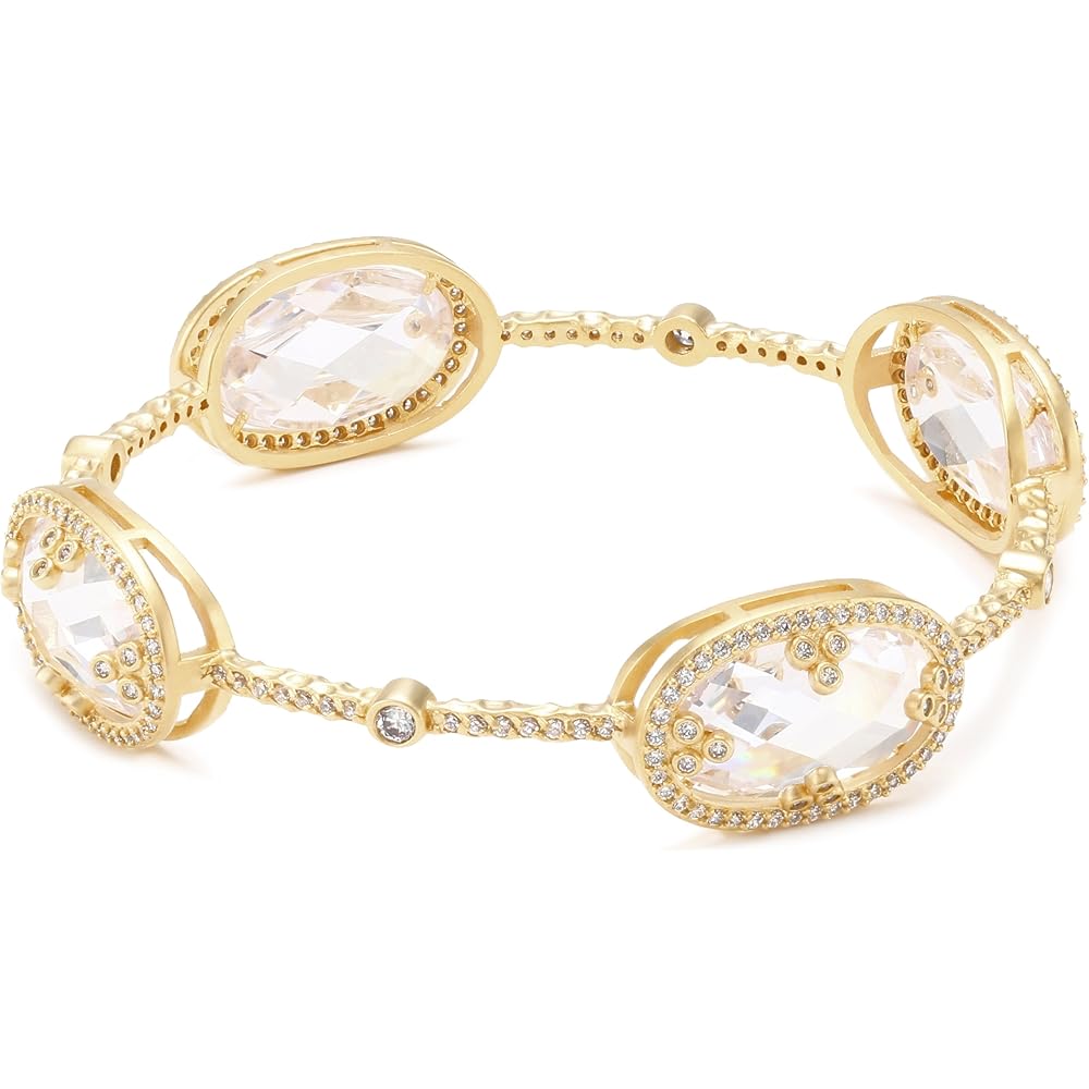 Crafted in 925 vermeil with gold-tone finish, this bangle features four oval-cut Cubic-Zirconia stations that look like mirror with prong-set petite Cubic-Zirconia rounds in between. This Freida Rothman’s piece, part of designer’s “Gramercy” collection, approximates 2.5 inches in diameter.
