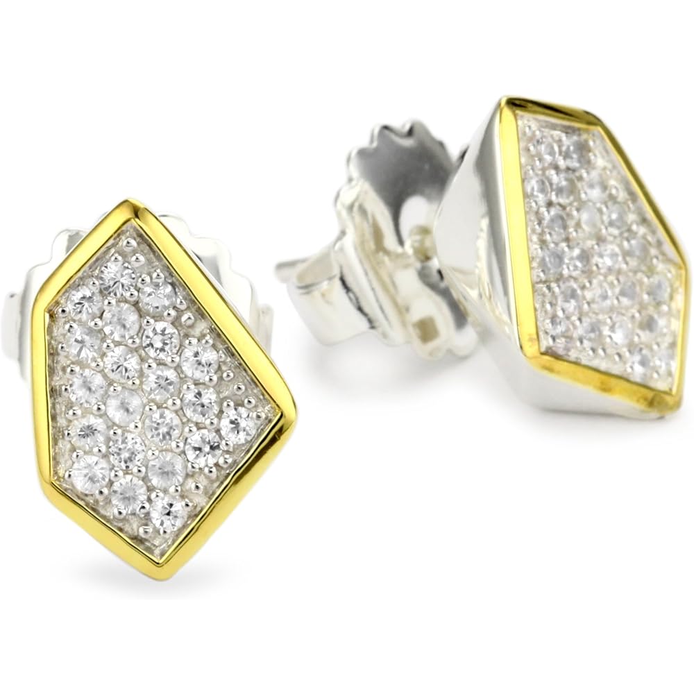 Part of “Pyramid” collection, the pave set white sapphires that uniquely faceted boast geometric style with sleek lines and contrasting tones. The gemstone texture with gold-toned trim adds sparkling character to an already statement-making style.