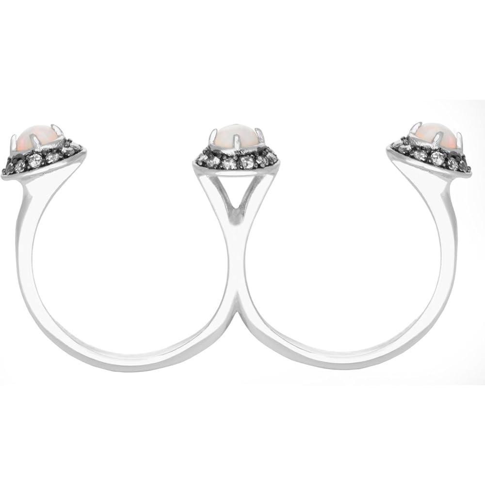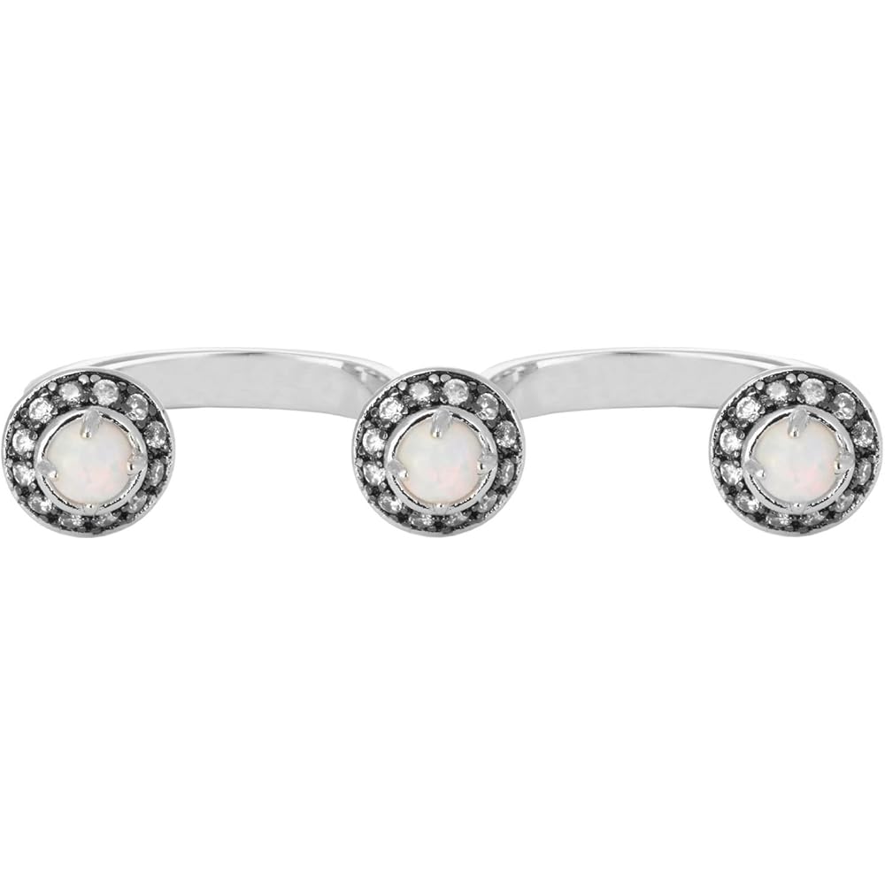 Crafted in your choice, this Kendra Scott “Odette” three-stone double finger ring has three color options include shiny rhodium-plated, yello-gold-plated, and rose-gold-plated over brass. Meanwhile, the unique white kyocera opal is a synthetic lab-grown opal. It has the reflective properties of an opal with a deep sparkle.