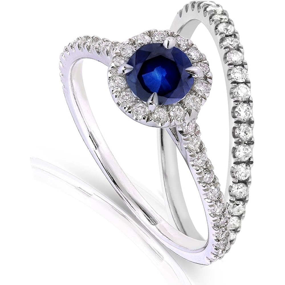 This stunning engagement ring set is crafted entirely of 14-karat white gold with a highly polished finish. This white gold engagement wedding features pave-set diamonds and a round-cut blue sapphire center stone and may be worn separately or together, depending on her mood.
