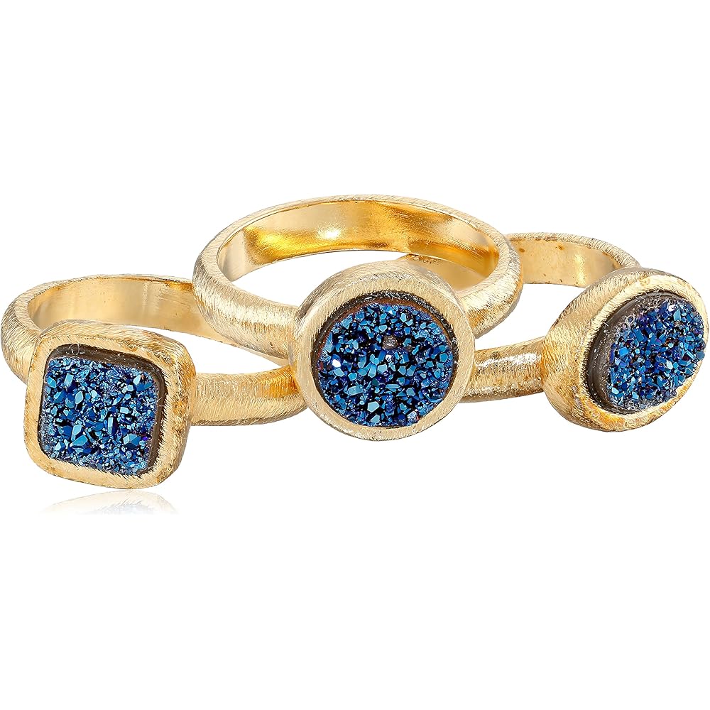 Taken from “Midnight” collection, the drusy stone is set of three stackable rings with round, square, and oval shape and the stone has two color choices include dark blue and purple metallic color, crafted of 18k gold-plated base metal.