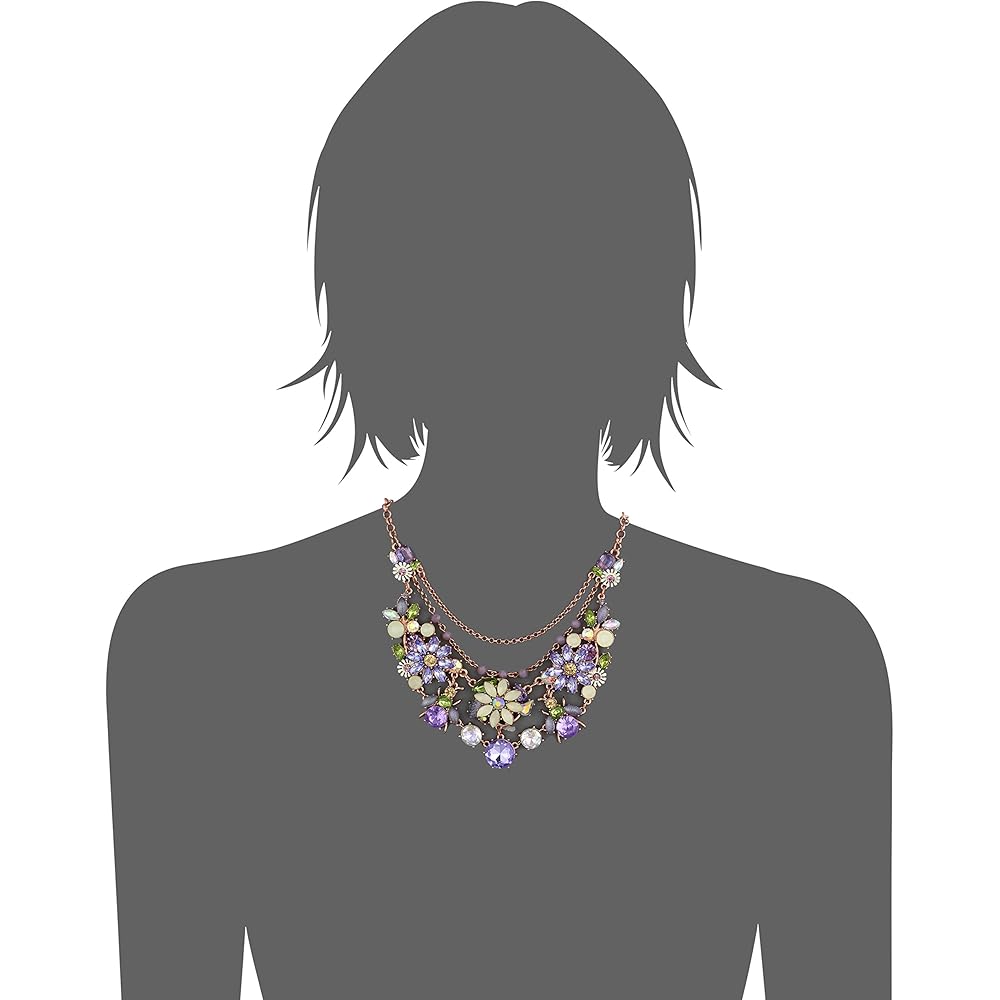 Crafted out of rose gold-tone mixed metal, this Betsey Johnson captivating bib necklace is casted with linked purple stones caparisoned with sparkling glass crystals and has the form floral and insect. This breath-taking piece ensures to capture everyone’s eyes. Equipped with rose-gold tone rolo chain, this flower and bug bib necklace is fastened with lobster-claw clasp.