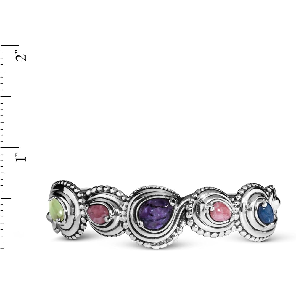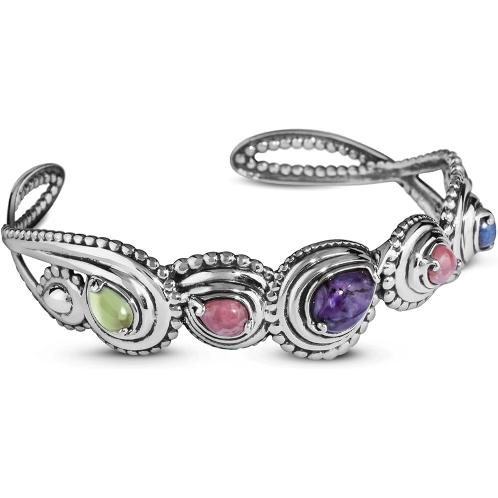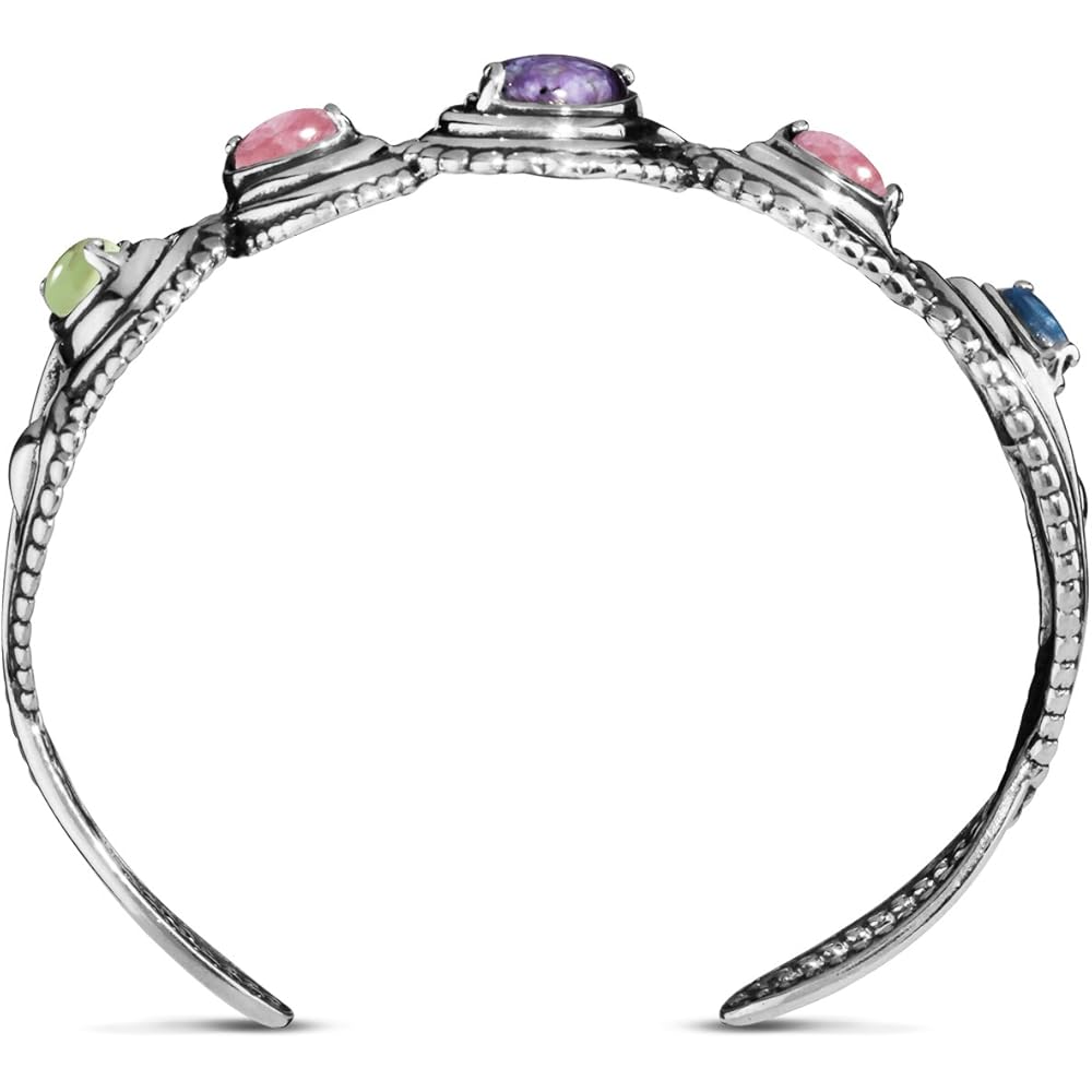 Measuring 5.75 inches long by 0.63 inch wide, the Carolyn Pollack bracelet is set in a very feminine setting with juicy gemstones. A lustrous 925 sterling silver setting, engraved in a swirl and beaded design, encases pear-shaped stones of purple Charoite, pink Rhodochrosite, green Prehnite and blue Kyanite.