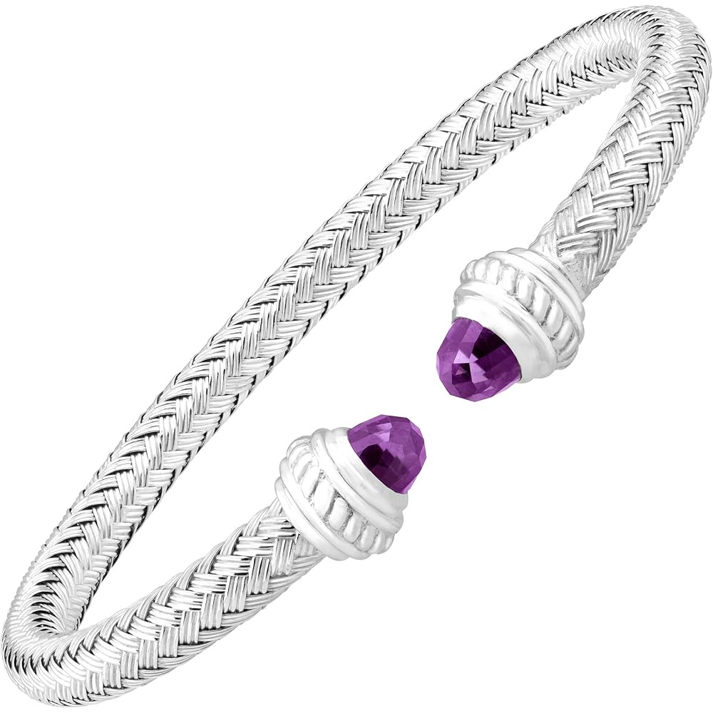 This Charles Garnier Albany woven sterling silver with rhodium finish for a timeless glossy shine is capped off with two special-cut natural amethyst stones in deep bright violet color. Piece of jewelry is a flexible 7 to 7½ inches in length and 0.31 inches wide.