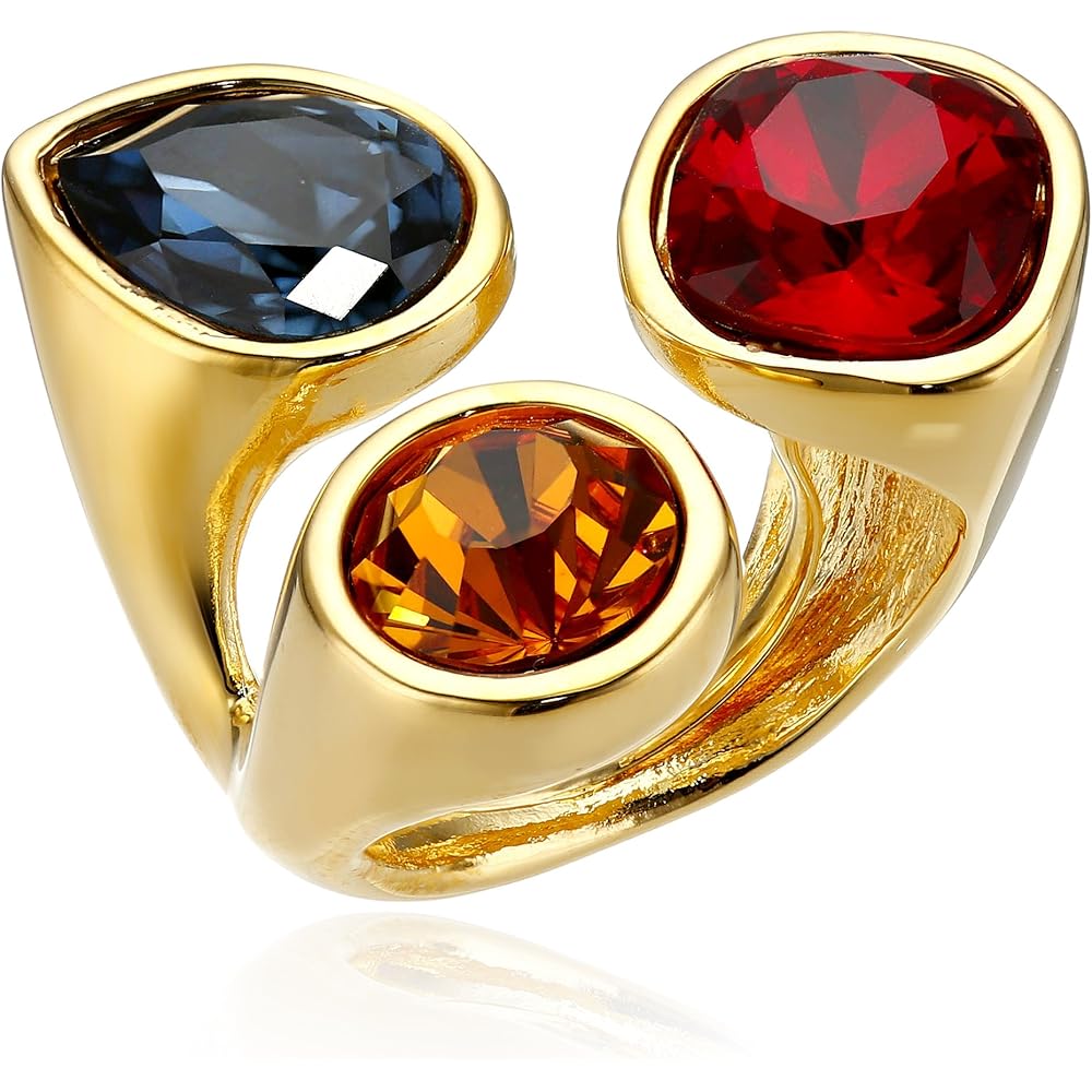 This Kenneth Jay Lane ring has a simple look with a dazzling impact. this piece of gold-plated jewelry is the perfect way to add some old school flair to your fashion. The band features three glass crystals that are set on cluster.